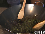 工程A 釜炒り それ以上の化学変化が起きないよう、茶葉に約100℃の熱を約1分間当てることで、各種の酵素活動を止める。長時間高熱を当てると、12時間も寝かせて生まれたせっかくの香りが、今度は焦げ臭くなってしまうので約1分で手際良く熱をまんべんなく与えねばならない。こういった炒り加減などに対する細かな配慮が茶葉の風味には重要なこと。 |