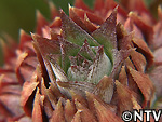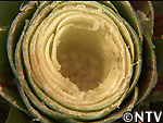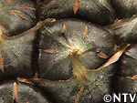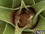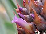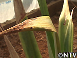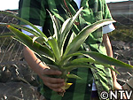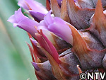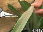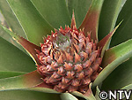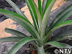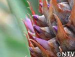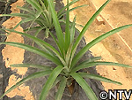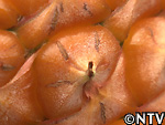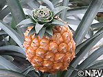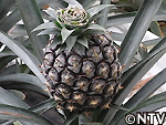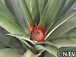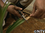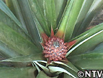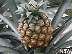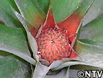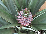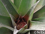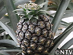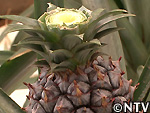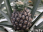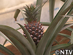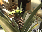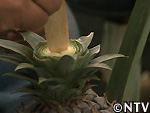 | 2009年 6月 冠芽(かんが)芯止め 開花時7cmだった実の大きさは10cmまで生長した。 実が生長すると共に、パイナップルの冠芽と呼ばれる部分も大きく生長し、実を大きくするためにも、これ以上冠芽に栄養を取られてはいけないということで、冠芽を4cmほど切り、木ヘラで生長点をかきとるとこに。沖縄でもこの「芯止め」という作業が行われている。 |