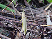 バッタは同じ種類でも、若草の中では緑色、枯れ始めた草の中では茶色という具合に、外敵に見つからないように、住む環境の色彩 に合わせた体色をもつようです。
