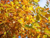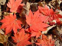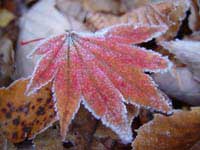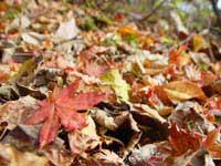 赤や黄色の淡い色に染まったカラフルな葉が、ふかふか積もっています。また、朝早くは、落ちた葉に霜がついて、シャーベットのようになっています。