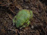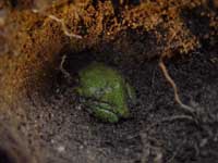 地中に育つトロロイモの出来を見ておこうと、手で穴を掘っていると、かえるが丸くなって目を閉じて、冬の眠りについていました。すぐに土をかけて元に戻しておきましたが、まだまだ冬。