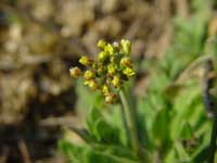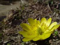 村役場の前の斜面に咲き乱れる福寿草の花、発見。花の鮮やかで深みのある黄色は、日のあたり具合によっては光り輝く金色にも見える。今年の春、最初に咲いた花。全部で六つ咲いていた。(2月26日午前8時)