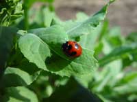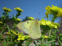 草に集まるてんとう虫の朱色、花に舞うチョウの淡黄色。