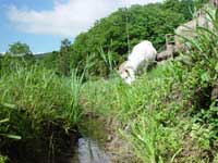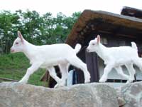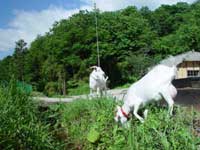 好奇心旺盛な仔やぎ兄弟は池の周りなど、落っこちそうな場所にも行くのですが、マサヨがついていれば安心です。目の届くところで跳ね回るわが子の成長を、見つめています。