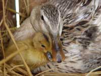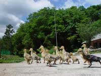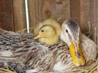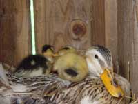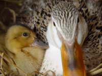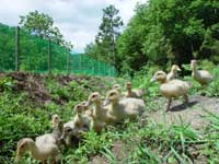 アイガモのヒナは今や親となった"うずら"や"さくら"たちに甘えてばかりいます。背中に乗っかったり、あたたかい羽の中に隠れたり・・・なかなか親のそばを離れようとしません。そして、親たちも、ヒナが小屋の外へ出て行くと、バタバタと追いかけ、まだ小さいので池に落っこちないか、見ています。