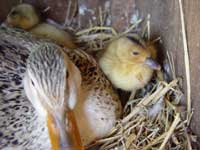 この"うずら"たちが温めてかえした5羽のヒナは、はじめ、それぞれの親のまわりにまとわりついていましたが、今は、他のヒナの親のところへも遊びに行くようになりました。