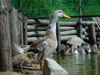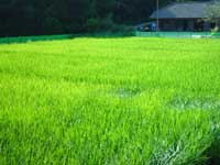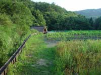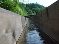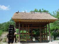 溜め池の脇の水門を開けると、水は約70メートルの草の上の水路を伝い、水輪の上に注ぎ、水輪は水しぶきを上げながら、ガタン、ゴロン、と勢いよく回りだします。そして、水輪の軸は、回転するごとに羽根を伝って杵を持ち上げ、杵はぺったんぺったんと、臼をつきはじめます。