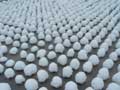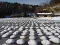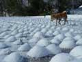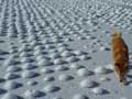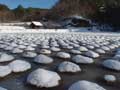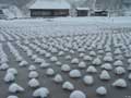 | 今年は、珍しい光景に出会うことができました。 田んぼ一面に、おわんをひっくりかえしたような模様が、ぽこぽこと現れたのです。 これは、田んぼに張っていた水の上に顔を出していた稲刈りのあとの株を、さらさらと降った雪がちょうど、株をすっぽり覆うくらいに降ったためにできたもの。 雪がかかった枝や葉を、雪持ちの枝、などといいますが、こうした風景を指す言葉はあるのでしょうか。ぽこぽこと、おもしろい眺めでした。 |