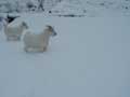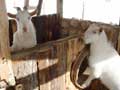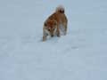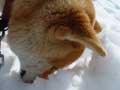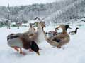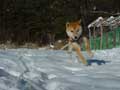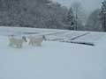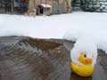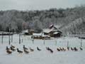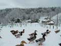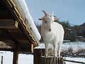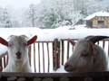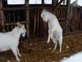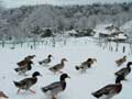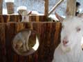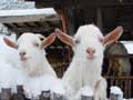 | 仔やぎたちは、初めての雪がこわかったのか、なかなか外に出て行こうとしません。兄のつかさは興味深げに雪を食べていましたが、弟のつばさは足が冷たいのか、雪に触れようともしません。 ただ、北登も、アイガモも、喜んで跳ね回っています。ですので、せっかくだからと扉を開けると、兄弟で家から飛び出して行き、いつもとは違う姿になった畑を駆け回り、真っ白な風景に溶け込みました。 |