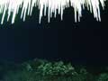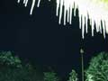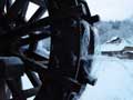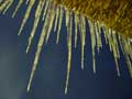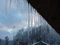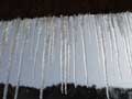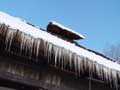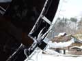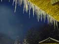 | 長いつららもできました。夜は、気温がマイナス5度くらいまで冷え込んだため、古民家の軒先には50センチほどの鋭いつららも下がり、夜中に光を当てたら、とてもきれいでした。 そして、水車も厚い透き通った氷でよろいのように覆われました。ただ、湧き水は流れているため、しっかりと回っています。キラキラしながら、回る氷の水車は迫力があります。 |