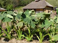 | また、里芋も成長を追っていて、興味深いものでした。傘のような大きく厚い葉、太い茎と、これまで見たことのなかった成長ぶり。この葉は水をはじいていたようでしたので、本当に傘としても使えます。そんな見た目も面白く、みずみずしい茎や葉の緑が青空とこげ茶色の古民家を背景にすると美しかったので、収穫するのが喜び以上にもったいないと思うほどでした。 |