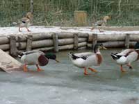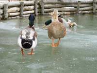 | 元日は幸いなことに晴れていて、山の上に昇る初日の出も拝むことができたのですが、そのあと雪が降り、今はとても寒く、温度計を見ると、いつも気温はマイナスです。 溜め池も凍ってアイガモたちのスケート場となり、これまで表面を氷で覆われつつも力強く回り続けていた自慢の水車も、ついに、凍って動きが止まってしまいました。食事をした後、皿や釜を水につけておくと、たちまち凍って洗えなくなってしまうほどです。 |