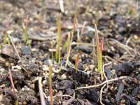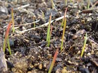 | 小麦を育てるのはこれで3回目です。毎年、雪が融けるころに芽が出るので、今年もそろそろかと見ていたところ、今週、ようやく、ところどころですが、芽が頭を出していました。 |