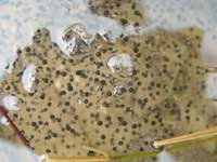 | そしてもうひとつ。今年は田んぼの隅のほうに、畳の原料となる、い草を植えてあるのですが、こちらの水の中に真ん中に黒い点のようなものがある透明な粒状のかたまりがたくさん現れました。 これはカエルの卵。 新しい命が芽生える季節となりました。 |