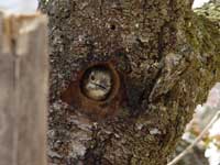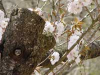 | コゲラの夫婦はあれから毎日来ています。ちょんちょんと幹をつたって穴に入っては、数秒後に再び姿を現し、木くずをパラパラと外にかき出す。1回1回少しずつ。単純な作業だけど産まれてくる自分達のヒナを想像してか、その動きは軽快でとても楽しそうだ。村の桜に来て2週間、今ではもうコゲラの姿がすっぽり隠れるほど巣穴は深くなっている。 |