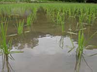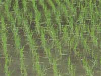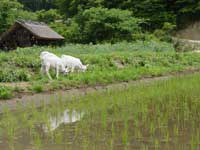| 田植え定規の印に合わせて3〜4本の苗を1ヶ所に植える。植え終えたら定規をかえして・・・ 簡単なようでこれがなかなかうまくいかない。手伝いに来て頂いた方々よりもどうしても遅れてしまう。 「コツはな、保原君。右手じゃなくて、左手だよ」と明雄さん。右手で苗を植えている間に、左手の親指と人さし指で苗の束から3〜4本よって次の準備をしておかなければならないという。これを明雄さんも孝子さんも見ないでやってしまう。そして一歩後退し、足跡をササッと手でならし、また苗を植える。この一連の動きが流れるよう。見とれていたら、また少し遅れた。 最後の苗を植え、ひねるたびにバキバキと音のする腰を起こすと、目の前にはきれいに整列した苗が一面に広がっていた。それを見たら自分にも出来たんだという満足感と、爽快感で疲れがふっ飛んでしまった。 苗を取る、苗をくくる、田植え定規を転がす、そして苗を植える。ひとつひとつに理由と工夫があり、思っていた以上に奥の深い作業。お味の方も想像を越えるものになるだろうか。秋の収穫が今から待ち遠しい。 |