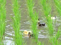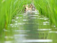 | そんな、稲に隠れてしまうほどの小さな雛たちが、雑草や稲につく虫をついばみながら、田んぼを泳ぎ回っている。彼らはこの世に生まれてまだ2週間あまり。こゆきやこてつの時もそうだったが、成長の速さには驚くばかりだ。 |
