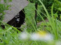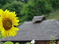 | 水車の前に咲くひまわり。 どんな花よりも、僕はこのひまわりから大きな生命力を感じる。太くて長い茎はとても力強く、太陽がそのまま形になったような花は明るく陽気で、見る者に元気をくれる。晴れ間には、ひまわりの大きな影がくっきりと地面に現れ、そこが北登の新しい涼み場となっている。 |