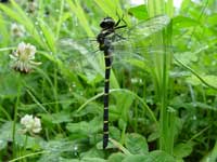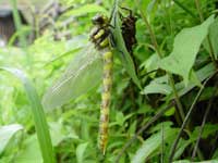 | ヤゴからトンボへ。実際に脱皮する姿を観察しても、この形の生き物の中からトンボが出てくることがとても不思議でならない。大きさは倍くらいになるし、形もまるで違う。トンボがヤゴの中にさっきまでいたという事実を受け入れることの出来なかった僕に、「アイガモの雛と同じだよ」と明雄さん。理解ではなく、納得させられた一言。 今日発見したのはオニヤンマ。脱皮したての体は、人間や他の動物の産まれたてと同じく濡れていて、見るからに軟らかそう。オニヤンマは抜け殻にしがみ付いたまま、その体を空気にさらし、乾燥させる。羽が完全に乾き、薄かった黄色と黒色の模様がくっきりと濃くなる頃、ふいに宙に浮いたかと思うとそのまま飛んで行った。明雄さんと二人で見えなくなるまで見ていた。オニヤンマが消えていく空はとても夏めいて見えた。 |