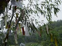| 雨が降り、時折涼しい風が吹く。笹の葉がサラサラと音を立てて、目にも耳にも涼しい。そんな七夕の夜、市川さんをはじめ、明雄さんや金光さんととても楽しく過ごすことが出来た。市川さんは浴衣姿で登場し、いつもの勇ましい姿とはうって変わって、おしとやか。北登もはじめは市川さんだと気付かずに吠えてばかりいた。番犬の役割をしっかり果たす北登でしたが、その2分後には市川さんにデレデレと甘えてばかり。本当に賢い犬です。 今回そんな北登のことを思う、皆様からの願い事がとても多くありました。劣らず、八木橋一家にも、アイガモ隊にも、田んぼにも、畑にも、たくさんの願い事がありました。笹と同じようにサラサラと揺れる短冊。それを見ながら、ここを管理する人間として、「夢の田舎」の住人として、気が引き締まる思いでした。 |