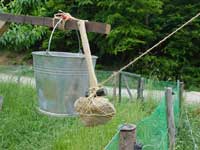 | 果樹園付近に漂うのは桃の香り。冷夏への対策、鳥への対策、あの手この手を尽くして、見事な桃を収穫することが出来た。特に、鳥から実を守るため、水車の力を利用して作ったオートマチックバケツは、今では村の新しい音として鳴り響いている。 |