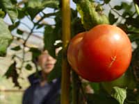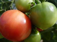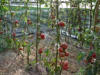 | 畑に建てたビニールハウスのトマトも夕日に焦がされたように真っ赤に実った。春、ポットから定植した後は、極力水分を与えずに育てたトマト。水を与えないで、はたして実るのだろうかと心配だった。それだけに、花が咲いた後、緑の実がなり、ふくらみ、遂に赤く染まった時というのは、それこそ夕日を見るように、ほっと一安心した。心配かけられ、手間隙かけた甲斐あって、味も見た目も最高のトマトとなった。 |