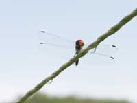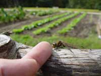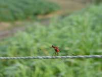 | そして、赤とんぼ。里山について詳しい守山先生がおっしゃっていた通り、秋が深まるとともにみるみる全身が真っ赤になってきた。赤とんぼはキュウリなどの支柱の先で、椅子取りゲームをするかのように、とまったり飛んだり。支柱の先を我が物に出来ずに飛び回り、最後には僕の差し出した指にとまったりする者もいる。しかし、夕暮れ時になるといつも皆で、空高く飛びだす。まるで、夕日が帰宅の合図であるかのように。面白い習慣だから、僕も、上空を赤とんぼが飛び交う時、その日の作業を終了するようにしている。 |