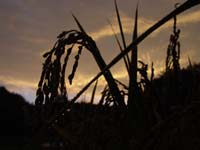 | 生育遅れでまだ穂が垂れていないものや、穂は垂れているが、中に実の入っていないもの。それらに鎌を入れると、いとも簡単に刈れてしまう。最後まで諦めなかっただけに、その軽い手ごたえは本当に辛いものだった。しかし、わずかばかりの立派な稲は、実のない稲に比べ、手ごたえや重量感があり、今までの努力が報われる思いがした。結果的には、少ない収穫となったけれど、稲を刈る悔しさと喜び、それらを一度に体験したことは、自分達にとって、大きな収穫と言えそうだ。 |