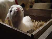| 古民家の土間にある、大きな木の箱には、マサヨと年末に産まれた仔やぎが暮らしている。仔やぎは箱の中を自由に歩いたり、寝ているマサヨの背中に上ろうとしたりする。そんな元気な姿を見て、ようやく新しい仲間の誕生を実感でき、心から喜べた。 |