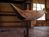 | 囲炉裏にあたるといつも目に入ってくる自在鉤。みんな同じことを思うかもしれないけれど、本当に良く考えて作られてある。自分たちで、つくってみて、初めてその構造が理解できた。見た目はシンプルなのに、鍋をぶら下げ、さらに上下に動き、火の調整が出来る優れもの。もし自分が、鍋の火の調節をしたいと思ったら、どんな工夫をして、どんな形のものを作っただろうか? こんな立派な代物ではないことは確かだと思う。横木の部分は、魚のほか、ひょうたんや、扇型のものもあり、魚の場合は、水の神とされ、縁起も良い。横木だけでなく、自在鉤そのものを見て、こんなにも暖かい形をしていて良かったとつくづく思う。 |