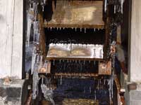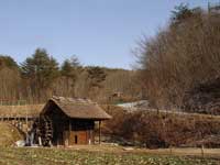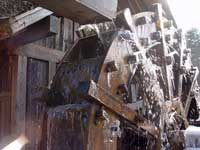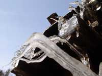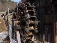 | 流れてくる水が階段を下る様に、下へと流れていく。真冬に比べると、曲線を描く氷柱は数が多く、細く短い。全体を覆う氷は、むらなく薄い。昨日まで元気よく回転していた水車は、今朝そんな姿を見せた。 寒の戻り。一晩で仕上がった氷柱は、水の動きがそのまま形になり、以前より繊細な印象がある。繊細な氷をまとった水車はまるで向日葵のよう。弥生の空を見上げ大きく深呼吸しているように見えた。 |