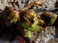 | 三月に入り、陽だけは依然として暖かい。気がつけばフキノトウが顔を出し始めていた。 村長のいる水飲み場の下から現れた、いくつかのフキノトウ。フキノトウは仲良くみんな同じサイズで、並んで顔を出し、水しぶきを浴びている。中には葉を開こうとするものもあれば、まだまだ葉で包まっていようとするものもある。いずれにせよ、まだみんな小さくて、トウが立つにはまだまだ。 |