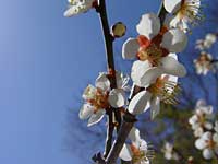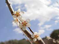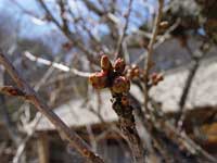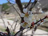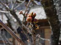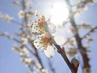 | 村役場の前に白い梅の花が咲いている。枝は空に向かって伸びて、花びらはいっぱいに広がって、見ているこっちが元気になりそうなほど力強く咲き誇っている。 それに比べ、梅の近くにある桜の木は、まだ開花していない。 |