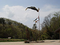 | その鬼瓦よりも高い場所で泳ぐ鯉のぼり。桜が咲いて散ったと思っていたら、もうそんな時期になっていた。 DASH村の鯉のぼりは、なかなか五つ揃って泳ぐことはなく、大抵下の四つが弱い風に吹かれて絡まり合ったりしている。あまりにもどかしく、長い棒でつついて直そうとするけれど、そう簡単には直らない。諦めて自然に戻るのを待っていると、なんだかそれこそ八木橋一家のように見えてきた。こうめがマサヨにじゃれていたり、つかさとみのりが遊んでいるように見えるし、それを気にせず泳ぐ異様に大きい真鯉も八木橋に見えてくる。五つ綺麗に揃って泳ぐのもいいけど、五つ思い思いに泳ぐ鯉のぼりも面白いと思った。 |