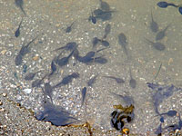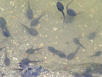 | 僕はこれらの理由全てを大したことないと自分に言い聞かせた。ヌルヌル感はコンニャクだと思えばいいし、かわいらしい表情はいつも見ているこうめと思えばいいし、ピョコピョコ跳ねるのはこうめの顔をしたこんにゃくが飛びついてきたと思えばいい。想像すると逆に怖いけれど、苦手ではないもので似たようなものはたくさんある。そう言い聞かせた。 そんなに意気込んでも、昼間カエルに遭遇することはまだあまりない。しかし、ため池や、畑のわきの沢では大量のおたまじゃくしが着々と大きくなっている。僕のタタカイはまだ始まったばかりだ。 |