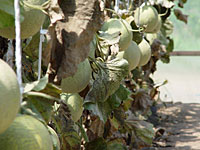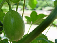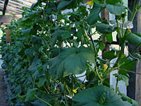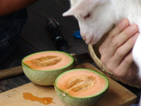 | 初めてのメロンづくりで不安もあったけれど、それ以上に期待した。メロンは期待に応え、順調に発芽し、葉を広げ、つるを伸ばし、実をつけた。また僕もそれに応えるように難しい水や温度の管理には充分注意して育てた。本当に手のかかる果物だと思いながらもがんばった。そして、夏。害虫や病気にやられながらも何とか収穫にこぎつけることが出来た。つるから切り離し、持ってみるとずっしりとした重みがある。色も、網目も、大きさも充分。遂に食べる時がきた。 |