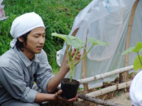 | 美味しくなくても形が悪くてもいい、ただただ大きくなってほしいと願った。でも、カボチャの実は全てすぐに白くしおれ、腐ってしまった。何が悪かったのかさっぱり分からなかった。 どでカボチャの大会会場には化け物のようなどでカボチャがたくさんあった。ピカピカしたオレンジ色の表面、抱きついてもびくともしない重量感、僕の太ももくらいある太い果柄。優勝した星島さんのなんか重さ416,6キロもある。もうレベルが違う。今まで自分たちもこのくらいのができるのだろうと想像していたのに、実物を目の前にすると怖気づき、「こんな大きさのは無理だな」と思えてしまった。 でも、大会出場者の方々の話を聞くうちにその思いも少しずつ薄れていった。間違いを指摘されることで、もっとどでカボチャのことを知ればもっと大きなのができると感じられた。 |