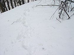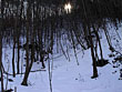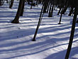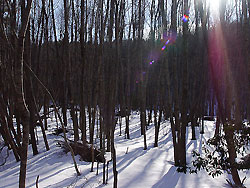 | 思ったとおり新雪だらけでギュッギュッ音をならしながらどんどん歩いていたら、物凄く寒くなってきた。雪が深くて長靴の中に大量の雪が忍び込んだからかと思ったけれど、それだけではなかった。里山の奥の方は太い木がたくさんそびえ立ち、その影がいくつも重なり合って大きな影が出来ていた。ひんやりとした空気はそのせいだった。 | ![]() |