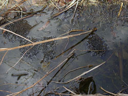 | 僕は冬が嫌いと言うわけではなく、春を待つのが好きな人間だ。だから、植物が土から出てきたり、景色が変わっていくのを凄く楽しみにしている。ただ、そういう風な気持ちと正反対の気持ちも、僕の春を待つ気持ちの中にある。今週その原因を、発見してしまった。ただならぬ殺気を感じたのはビニールハウスの横。そして、やはりそこにいた。溝のなかで集まる小さな球体。その中には、まだおたまじゃくしにもなっていないゴマのような小さな小さなカエルの姿があった。仕様がないことだけど、毎年その卵の数を見ると気が滅入る。 |