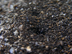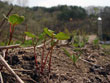 | アリの巣が集まる役場裏の斜面は、昨年のそば畑。 まだ何も手をつけていないこの土地から、今年もまたそばの芽が出てきている。 ピンクの花が咲く貴重な種と言いつつも、結構な数の種を落としてしまっていたらしい。でもこのままにしておいて、収穫できるようになったらどれほど楽だろうか。何もしないで、またあのおいしいそばが食べられたら・・・。アリたちの前では、そんなことを思うこともいけないような気がした。 |