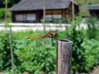 | この主役たちの放つ光でいっぱいの畑に、キラリと光る目を持ったトンボたちも集うようになった。支柱にとまるトンボのアキアカネもすっかり村での夏の風物詩。畑では、夏らしい顔ぶれがキラリとしながら足並み揃えてあらわれ始めている。 |