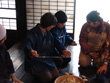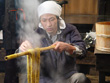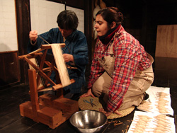 | 池上さんと梅沢さんからは、糸紡ぎや機織りなど失われかけている日本の古の技を、鈴木さんには紅花という植物で染色することや、その繊細な作業から生まれる紅花染めの素晴らしさと可能性を教わった。そして機織りをはじめてやる明雄さんの貪欲な好奇心や、昼夜を問わず合間を縫って機織をしたみんな。 | ![]() |