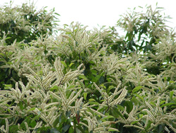 | 栗の花は淡い黄色で、クリーム色とも呼べそうな温かみのある色。緑色ばかりの里山の中にあるその色は、一見白色だと言いそうになるけれど、村のあちこちに点在するハルジオンの白色と比べるとはっきり黄色を帯びているのが分かる。 |