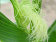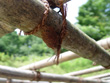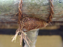 | 母屋の脇へと移したぶどうの棚、そこには二週間ほど前から緑色の毛虫がいた。いつもその下を歩くたび、落ちてこられると嫌だから毛虫の位置を確認していたけど、その日はずっとその場所から動かなかった。次の日、その毛虫はまだ昨日と全く同じ場所にいた。でも、昨日とは随分様子が違うのは、体の回りに繭をつくっていたこと。まだ途中段階で、中の毛虫が良く見えた。一生懸命体をモゾモゾさせて繭をつくってゆく毛虫は、名前も知らない蛾になるらしい。 |