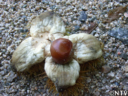 するとそれは、「ヒトデの形」をした「栗のイガ」だった。完全に私の早とちりだった。それにしても、栗の実がとび出した後のイガの殻はヒトデの形によく似ている。私の目がおかしいのではなく、疲れているわけでもなく、夜だったら誰でも間違えるに違いない、信じて欲しい。 そんなことを思いながらやっと炭小屋に辿り着いた。炭を持って母屋へ戻ろうとした時、すぐ近くの草むらで「ガサガサ」と変な音がした。雨が降っているだけでも夜の怖さは3割増しなのに、まさかイノシシ? 私に何か恨みでもあるのかなどと思いはじめたらますます怖くなって母屋に帰れなくなってしまった。 |