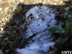 手が凍るような寒い朝、太陽の下でひときわ輝くのは「霜柱」。 氷の柱は地面の土を跳ね除けるかのように堂々と立っている。 透明でキラキラと輝き、なんとも言えない美しさ。自分で作ろうと思ってもなかなかできないものだけあって、その珍しさに時間を忘れじっと見つめてしまった。それは北登も一緒だった。 |
