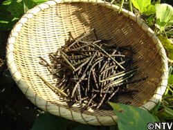 | しかし、この氷以上に透明でキラキラ輝くおいしいものがこの冬完成した。 それは、春の雨と書いて「春雨(はるさめ)」。名前の通り、春の雨に似ていることからこの名前がつけられた。 ヘルシーということもあり今まで私も食べることは多かったけれど、春雨がどうやってできているか、何からできているか全く知らなかった。 栽培を始める時ですら、春雨の原料が「緑豆(りょくとう)」と分かったものの、どんな豆なのかも分からない。それもそのはず、「緑豆(りょくとう)」という作物自体、栽培が難しいということもあり、日本では栽培されていない。そのため、小豆や大豆と同じ豆の仲間ということを頼りに手探りで進めていくしかなかった。 |