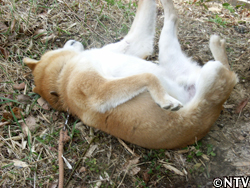 | 北登もこの梅の美しさに惹かれたのか、梅の木の下で背中をこすってじゃれ始めた。その仕草はとてもかわいくて面白かった。おそらく梅に惹かれている私にもっとかまってほしかったのだろう・・・でも今は梅を見させてほしい、ごめん北登。 |