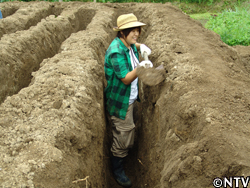 リベンジとなった「守口大根」栽培。前回は80cm。普通の大根よりは長く育ったものの、守口大根本来の長さの1mを超えることはできなかった。リベンジということもあり、今年こそは1mを越えたかった。 そのための下準備、畝づくりは前回にもまして大変な作業だった。1m近く掘り、1m50cmの巨大な畝を作る。腰が痛くなってしまった。 |
