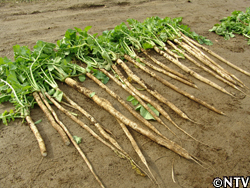 | そんな畝で守口大根はのびのびと育ち、大きな被害もなく無事収穫となった。1本ずつ緊張しながら、引き抜いて行く。無理矢理引っ張るとすぐ折れてしまう。でもある程度強い力で引っ張らないと抜けない。本当に難しい作業だった。 |